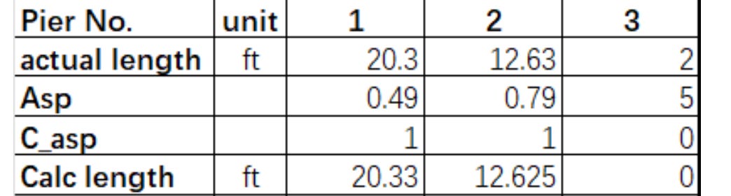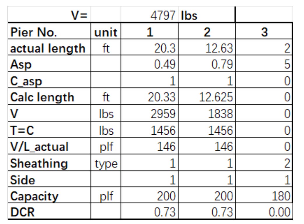 According to the AWC SDPWS, the individual wall segment with aspect ratio larger than 3.5 shall not be considered as a shear wall, and a segment with aspect ratio larger than 2 would take shear capacity reduction. The Casp value in the table below is therefore introduced to account for this adjustment. Casp takes value of 0 when the pier's aspect ratio exceeds 3.5 and takes value of 1 when the aspect ratio is less than 2. We then obtain the calculated length of each pier by multiplying Casp with the actual length.