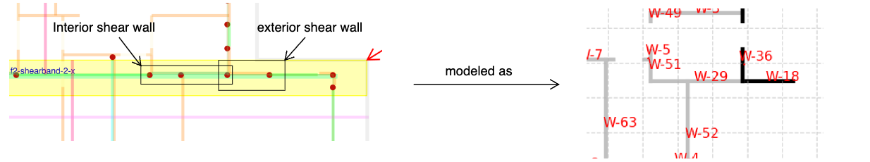 When we model the architecture, we may chop up walls into segments and label them accordingly to reflect differences between interior and exterior walls. For instance, within "f2-shearband-2-x", wall-29 is an interior wall and wall-18 is an exterior wall. They are labeled as separate walls in our architectural modeling.
