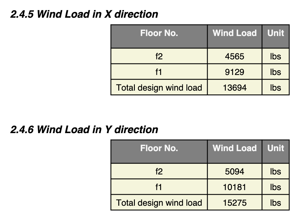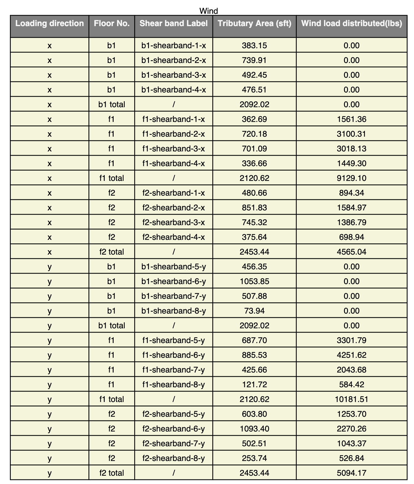 In Calculation Sheet, we include summaries of seismic and wind lateral force distributions on each shear band for each floor.