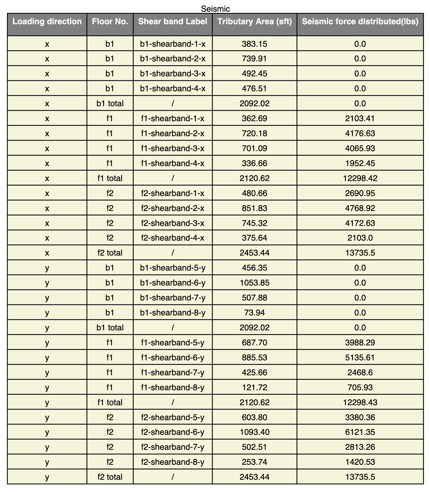 Calculate load by multiplying the tributary area with the load per square foot. For example, the tributary area of "f2-shearband-2-x" is 849 sf, so the seismic force distribute to this shear band is 5.648 × 849 = 4797 lbs.