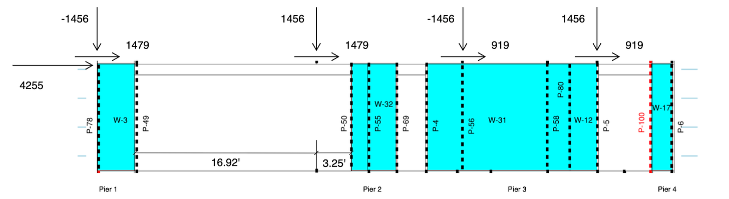As an example, the shear load on pier 4 = 9052 × 16.08 / (3.08 + 4.06 + 16.08 + 0) = 6270 lbs.