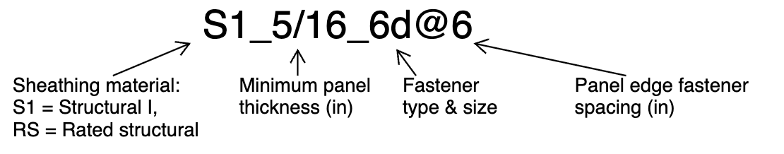 Therefore, the sheathing for the pier, including walls 29 and 18, is designed to be S1_5/16_6d@6, whose capacity is 200 plf. The DCR for these two walls are 0.73. Here, "S1_5/16_6d@6" means