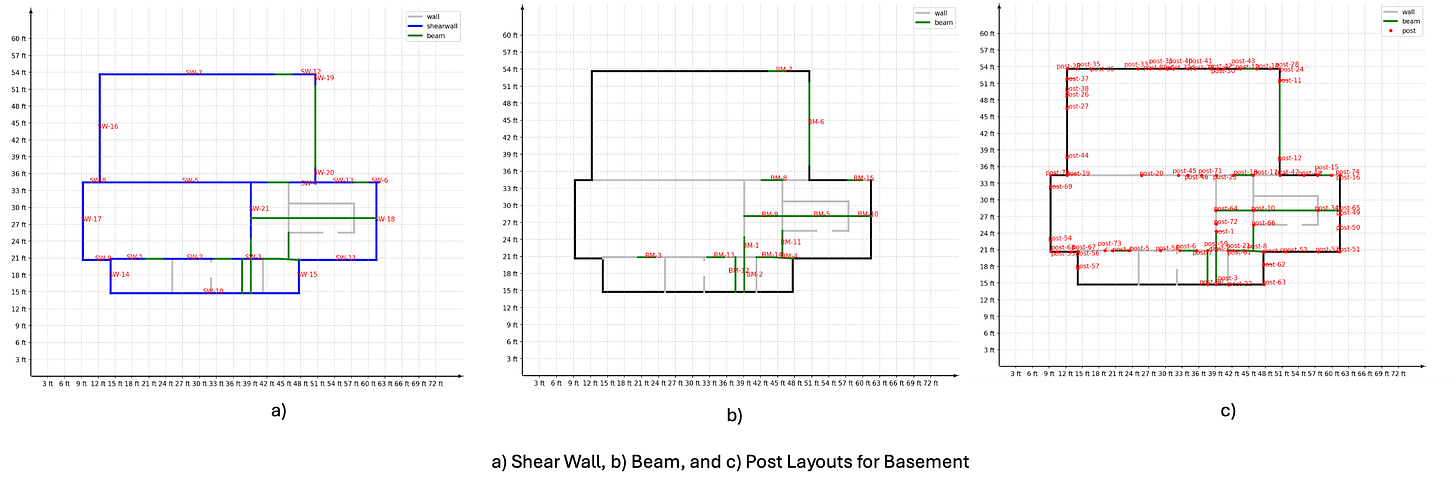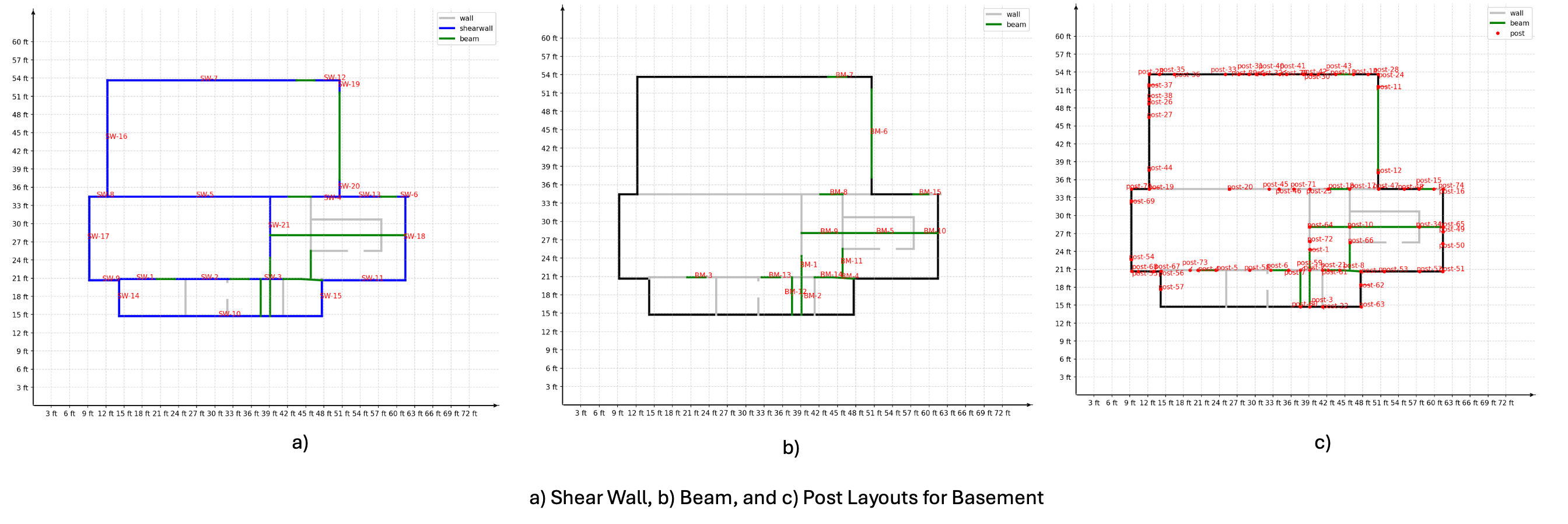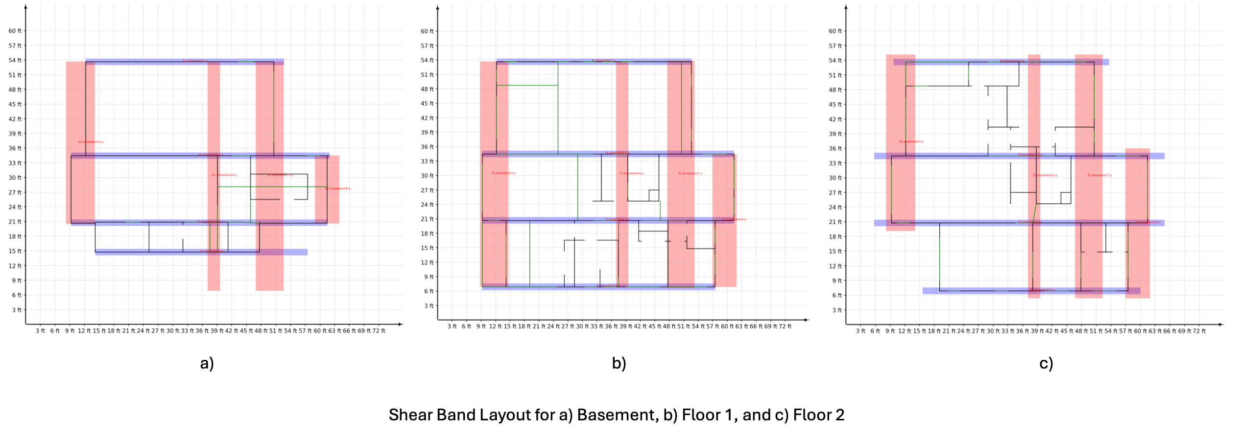 The first step to design the lateral system is for our Generative AI to suggest layout options of shear bands. A shear band is similar to a "shear line" or a "braced band" but considers slight offsets between shear walls and beams that form the same shear band.