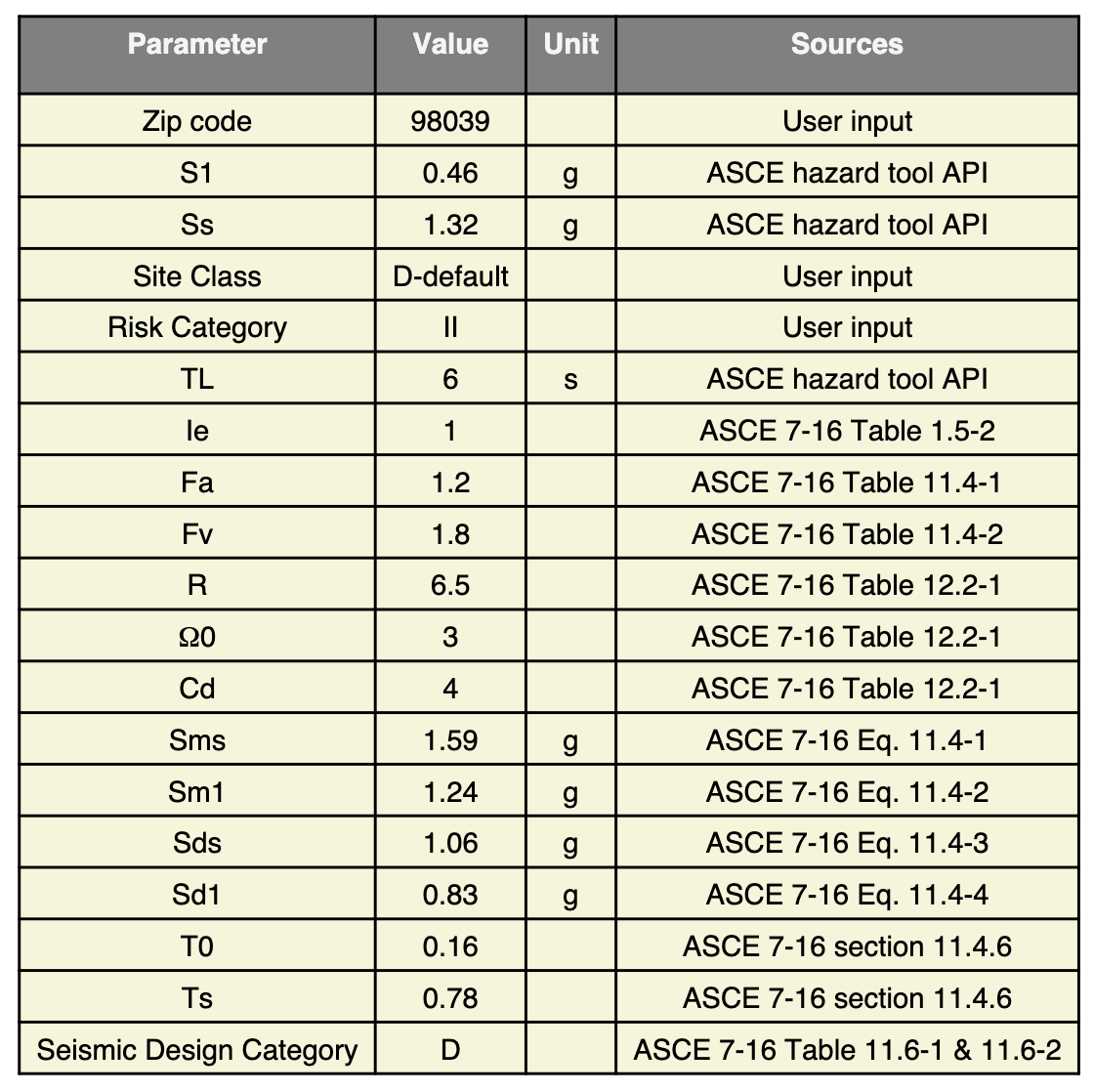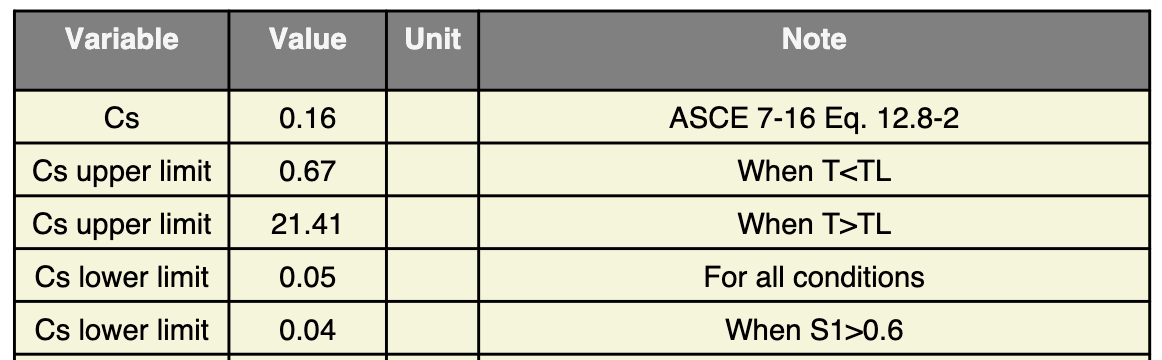 To calculate these values, we include the relevant parameter inputs based on the property location and specifications in this following table on page 9 in the Calculation Sheet and derive the value of Cs. We also check the upper and lower limits of Cs to make sure our calculated value falls within the applicable range.
