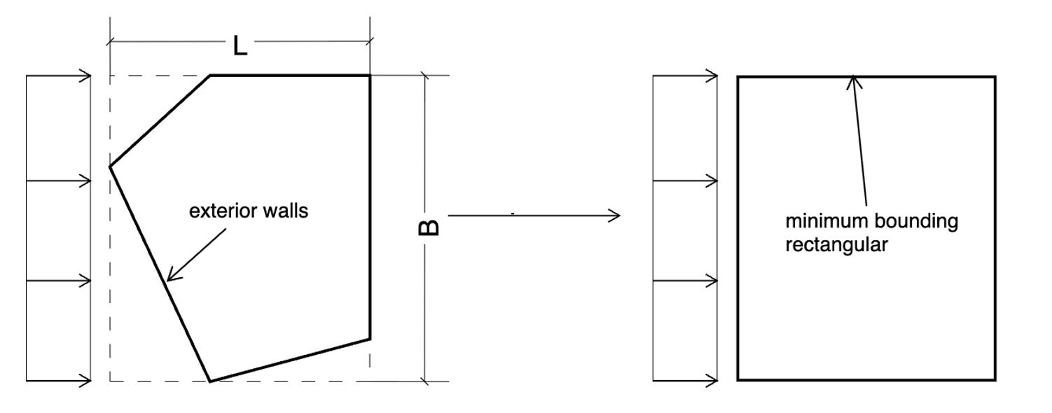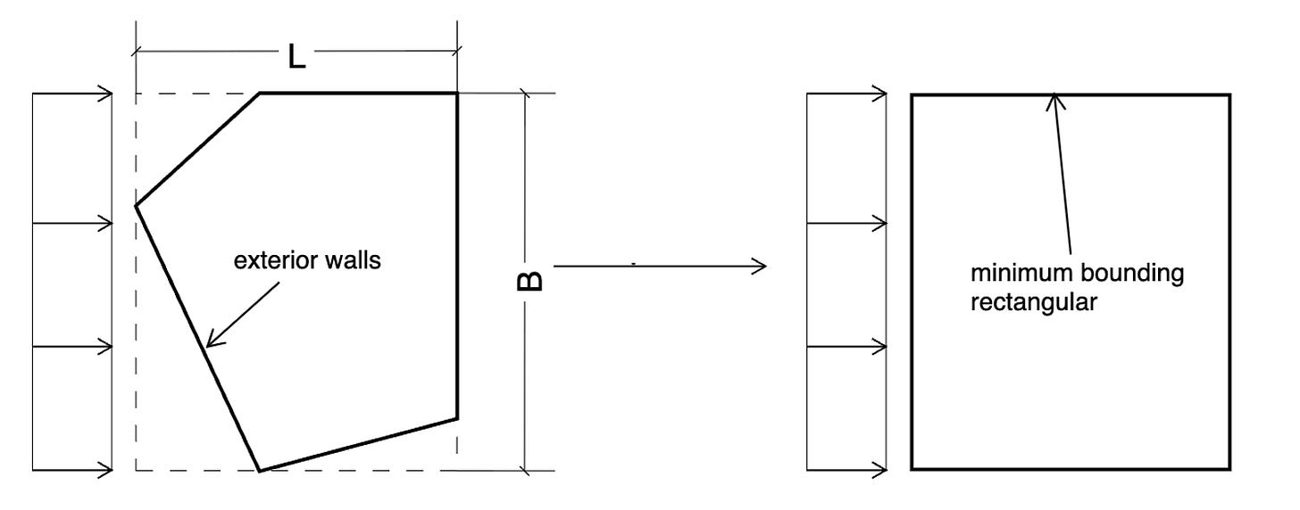 For wind pressure calculation, we simplify the building contour, often in complex shapes, to its minimum bounding box and consider the wind pressure applied to the bounding box instead. We believe doing so will not introduce errors as long as the building contour is convex and enclosed, because the x and y components from different sides will add up in effectively a rectangular shape. This assumption should hold true for most of the low-rise and mid-rise residential projects.
