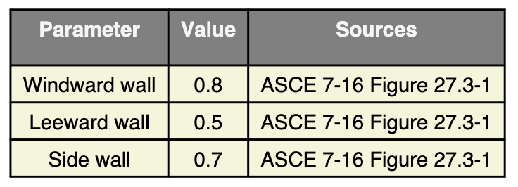 To work out the wind pressure, we follow ASCE 7-16 Fig 27.3-1 and obtain the following values as shown in Calculation Sheet page 12.