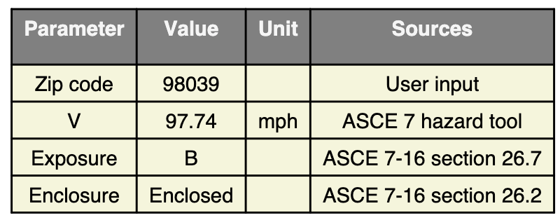 As for the sample project, we obtain the following site parameters following the zip code of the location, assuming the project has exposure category B and is enclosed. The basic wind speed for this location is 97.74 mph based on the ASCE 7 Hazard Tool.