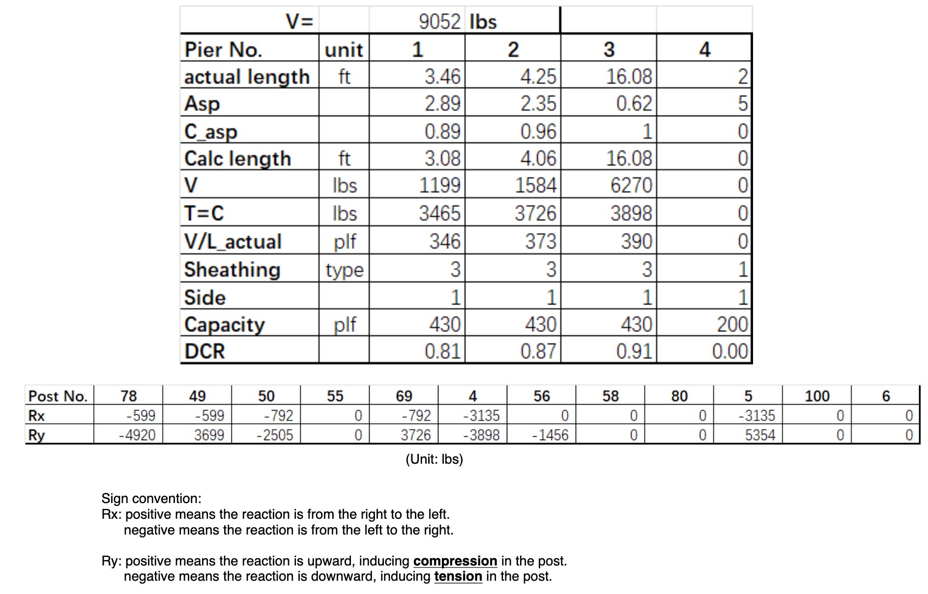 The tension and compression couple T = C = v × h / L, where L is the actual length of the pier. For example, for pier 2, the seismic load it takes is 1838 lbs, and the tension and compression on pier ends are 1838 × 10 / 12.63 = 1456 lbs. These loads are reflected by the vertical reactions at the posts' bottoms.
