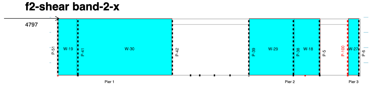 However, when two shear walls are aligned and next to each other, typically they would be sheathed together and work together to resist the lateral forces. Therefore, we introduce the concept of a wall pier, which group these separate walls together to resist the lateral loads. For our example shear band, it will be grouped into three wall piers, and wall-29 and wall-18 are grouped as pier 2.